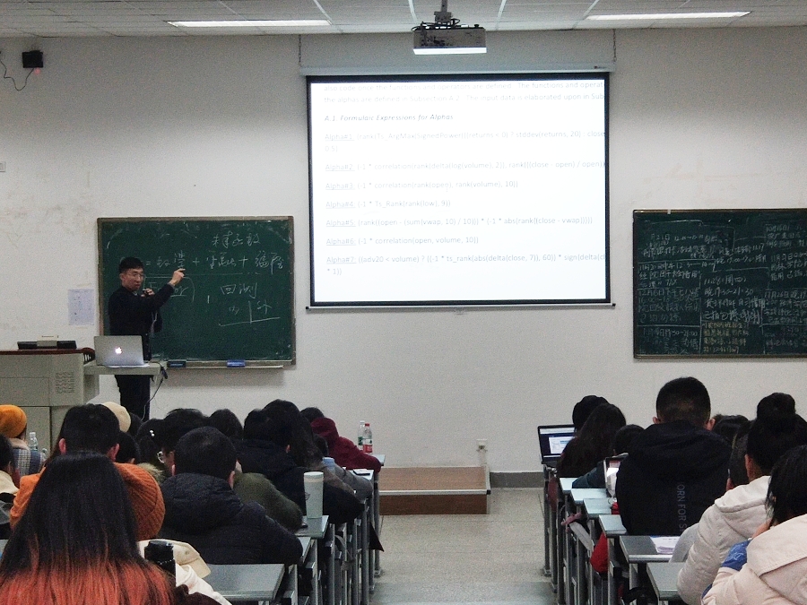 讲座中,周西仑和金俊玲两位分别从金融数据自动化获取、量化投资因子挖掘与评价、基于云平台的投资策略构建与回测、预测型量化策略开发的框架与细节等方面向在场师生作详细介绍。整场讲座过程中,同学们积极与老师互动,向老师提出疑问,两位讲师耐心解答同学们的疑惑。同学们展现了对量化交易浓厚的兴趣,大家专心致志的听讲,并且积极参与提问,现场座无虚席,气氛热烈。