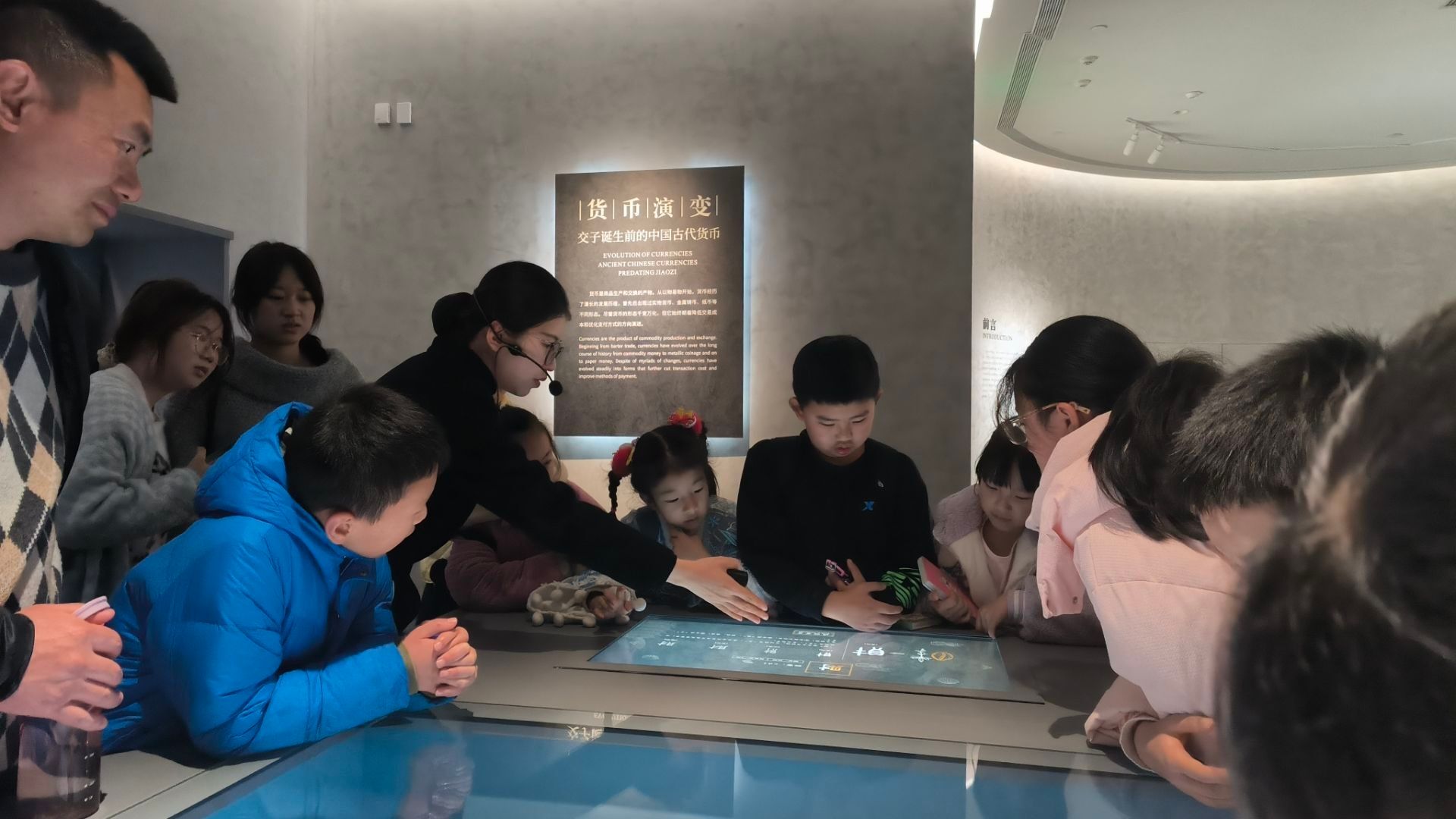 图为孩子们倾听博物馆讲解员讲解货币知识。杨冰也 供图