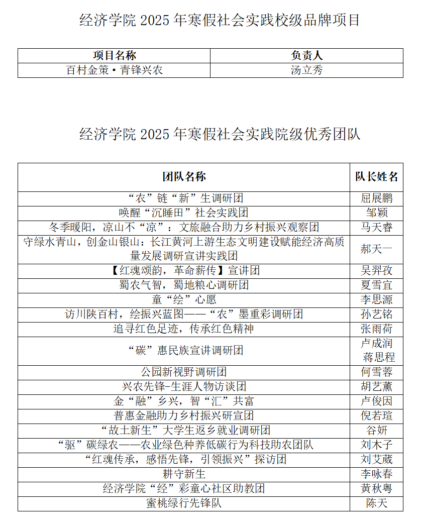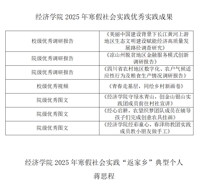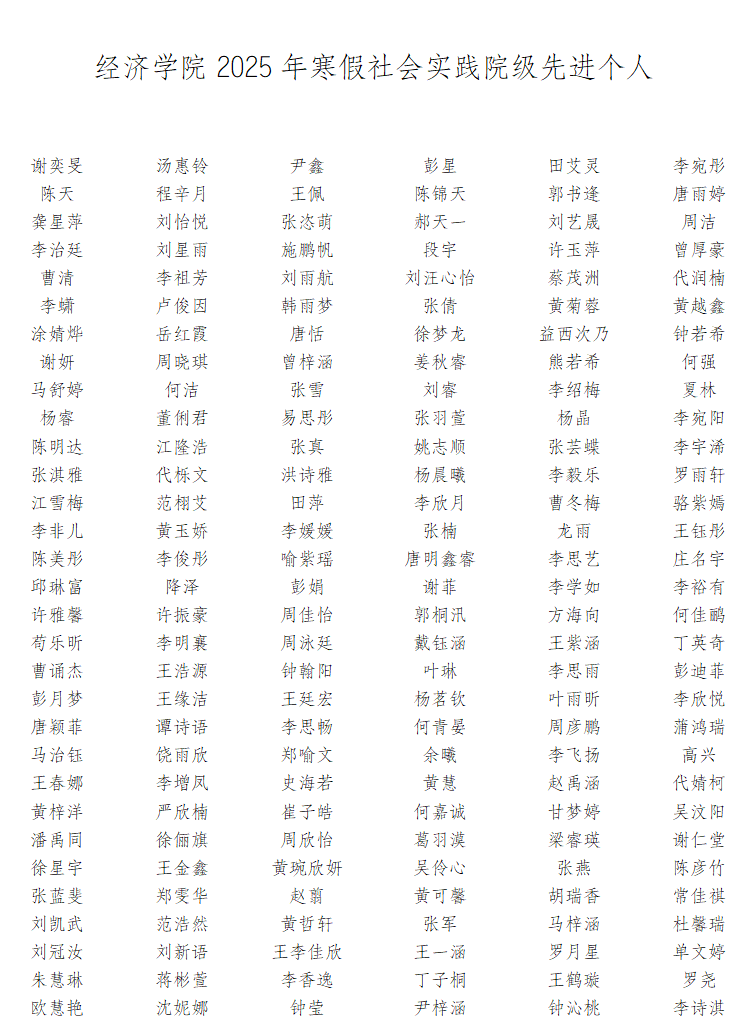 根据校团委《关于开展2025年学生“返家乡”寒假社会实践评优工作的通知》,经过个人自荐、团支部评议,团队申请、学院社会实践领导小组评审表彰以下团队和个人,现公示如下。