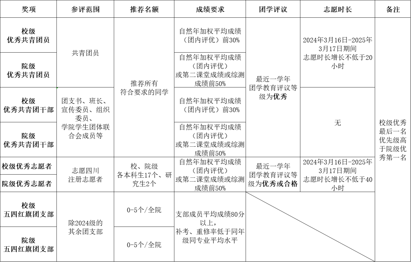 注:由学院筛选并拟评等级,校级优秀的最后一名优先级高于院级优秀的第一名;优秀共青团干部和优秀共青团员不重复获评。