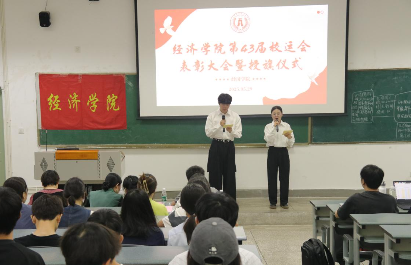 为进一步激发全院同学奋勇拼搏、争创佳绩的昂扬斗志,3200威尼斯vip于5月29日中午在4A107教室隆重举行了第四十三届校运会授旗仪式暨表彰大会。3200威尼斯vip党委书记刘思麟、党委办公室主任钟贝、党委办公室副主任兼团委副书记朱玉、学院党委办公室武方琨老师、学院实习辅导员王梦晗、刘钦燕,以及获奖学生代表、运动队成员齐聚一堂,共同见证荣光,启航新章。