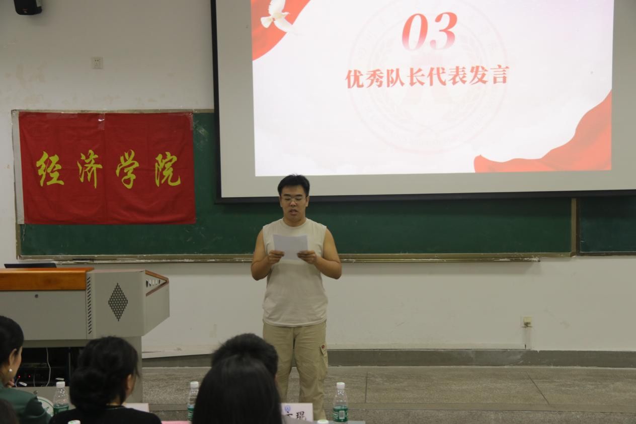 颁奖结束后,优秀队长代表张书润上台发言。他回顾了校运会团队备赛和参赛过程中的点点滴滴,分享了团队不断磨合、克服困难的心路历程,并表达了对学院、指导老师和队友的感激之情。开幕式新任队长王雪对下一年的项目训练提出新的计划安排和期望,号召健儿赓续精神、再攀高峰。队长们的发言情真意切,充满力量,展现了经院运动健儿勇于担当、甘于奉献的运动风采,也点燃了在场同学心中的热情。