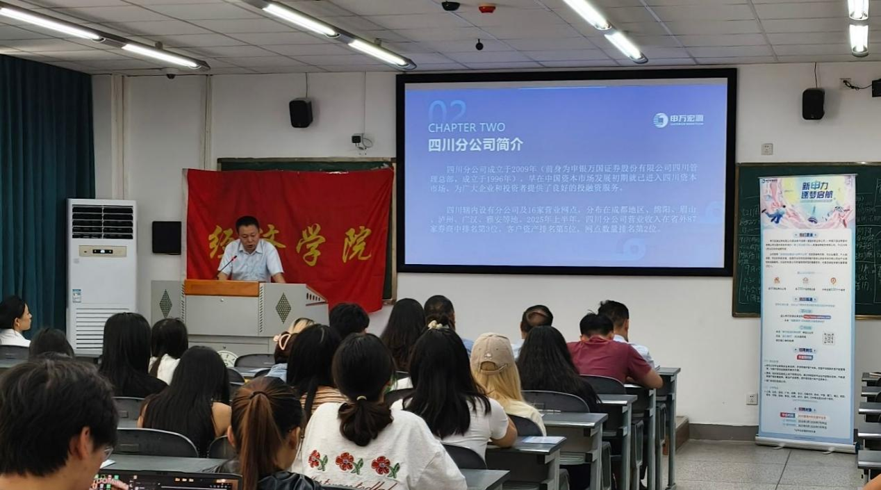 919日下午,学院与申万宏源证券有限公司泸州营业部联合举办的2025届秋季校园招聘宣讲会在4B209教室成功举行。本次活动是学院深化三全育人综合改革、完善全链条就业支持体系的重要举措,旨在通过校企协同为学子拓展高质量就业渠道,助力培养适应现代金融业发展的复合型人才。