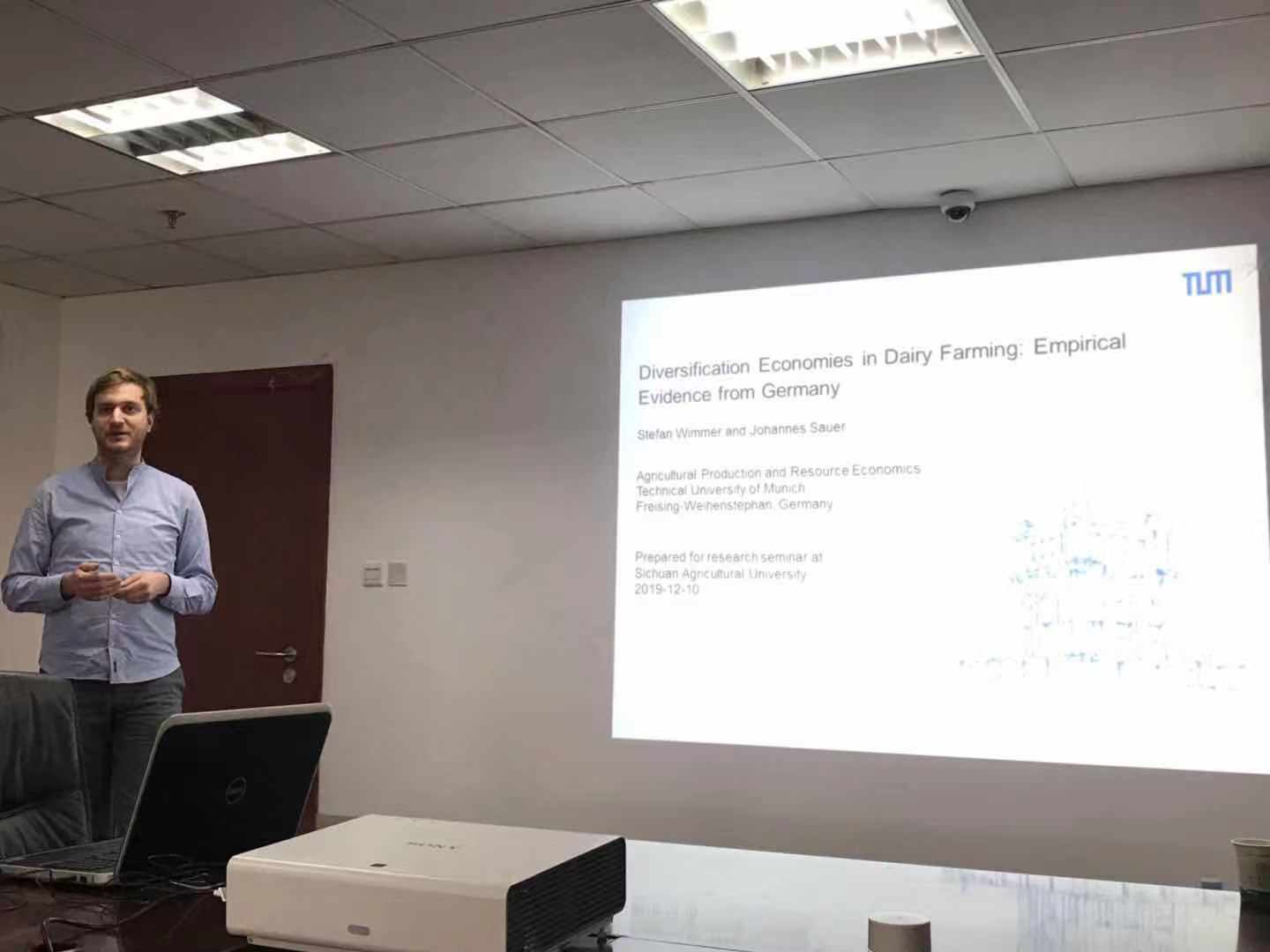 会上,吴平副院长首先代表川农大3200威尼斯vip对Johannes Sauer教授一行的访问表示热烈欢迎,同时向他介绍了我校和威尼斯官网的基本情况,表达了将来与德国慕尼黑工业大学进一步合作的愿望。其次,Johannes Sauer教授介绍了慕尼黑工业大学的基本情况及生产与资源经济研究项目的现状与发展,并和与会老师进行座谈,初步达成了与3200威尼斯vip进一步合作的意愿和共识。最后,由慕尼黑工业大学的Stefan Wimmer和Xinqi Zhu两位博士研究生分别为我们作了题为“Diversification Economics in Dairy Farming: Empirical Evidence from Germany”和“Bioplastics and Biofuel Policy in the EU–Impacts and Interactions”的学术报告,同与会师生展开了讨论。