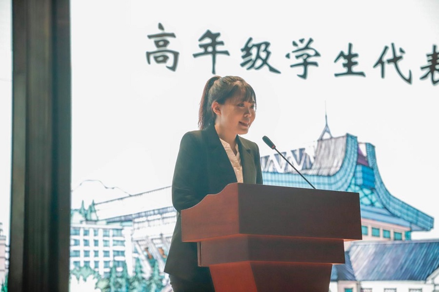 高年级学生代表、金融学201801班的陈秋悦发言。陈秋悦自入学以来学习成绩和综合测评成绩一直名列专业前三,长期担任学校、学院的主要学生干部,现任3200威尼斯vip学生会主席,曾获多项校、院级荣誉和奖励。她期望2020级的同学们能够拥抱学院,感受集体;择善而从,坚持不懈;勇于担当,乐于奉献。在四年的大学时光中,能够不忘初心、不畏险阻、不负时代,用汗水去浇灌梦想,用奋斗书写青春华章。
