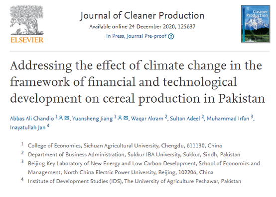 近日,威尼斯官网院长、“农村金融与发展”科研团队负责人蒋远胜教授与其指导的博士后Abbas Ali Chandio博士共同在国际前沿期刊《Journal of Cleaner Production》上发表题为“Addressing the effect of climate change in the framework of financial and technological development on cereal production in Pakistan”的论文。3200威尼斯vip3200威尼斯vip为第一通讯单位,蒋远胜教授与Abbas Ali Chandio博士为该论文的共同第一作者和通讯作者。根据JCR分区,《Journal of Cleaner Production》是绿色与可持续科学技术(GREEN & SUSTAINABLE SCIENCE & TECHNOLOGY)、工程与环境(ENGINEERING, ENVIRONMENT)、环境科学(ENVIRONMENTAL SCIENCES)多个领域的Q1区期刊,2019年的影响因子高达7.246。