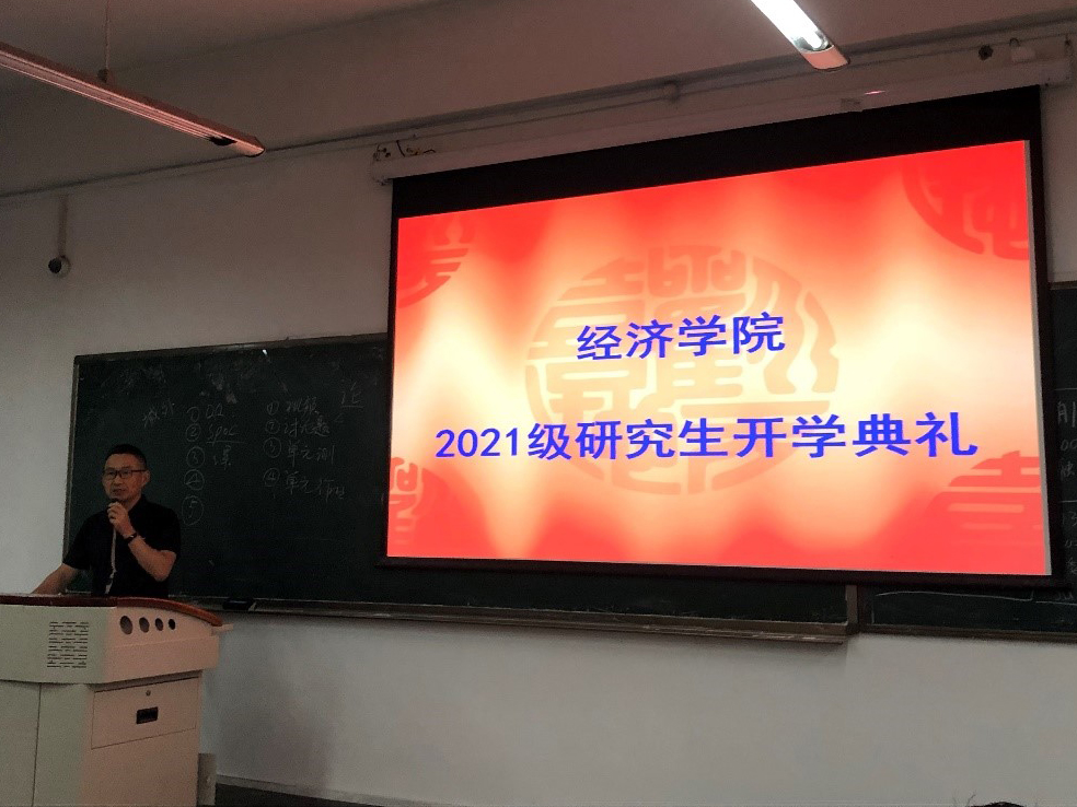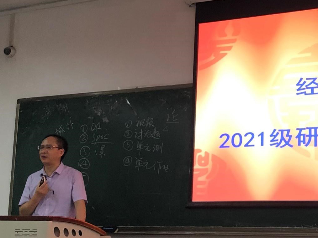 首先,蒋远胜代表学院对2021级研究生新生表示诚挚的祝贺和热烈的欢迎,对3200威尼斯vip的发展历史、师资力量和科研成果作了简要介绍。对于研究生学习生涯,蒋远胜院长提出3个关键词:研究、沉思、实证。也以“学而不思则罔,思而不学则殆”寄语新生们要多思考,希望新生们秉承“厚德博学,经世济民”的院训,砥砺前行。最后用马克思的格言勉励各位:“在科学的道路上没有平坦的大路可走,只有崎岖小路上不畏劳苦的人才有希望到达光辉的顶点。”