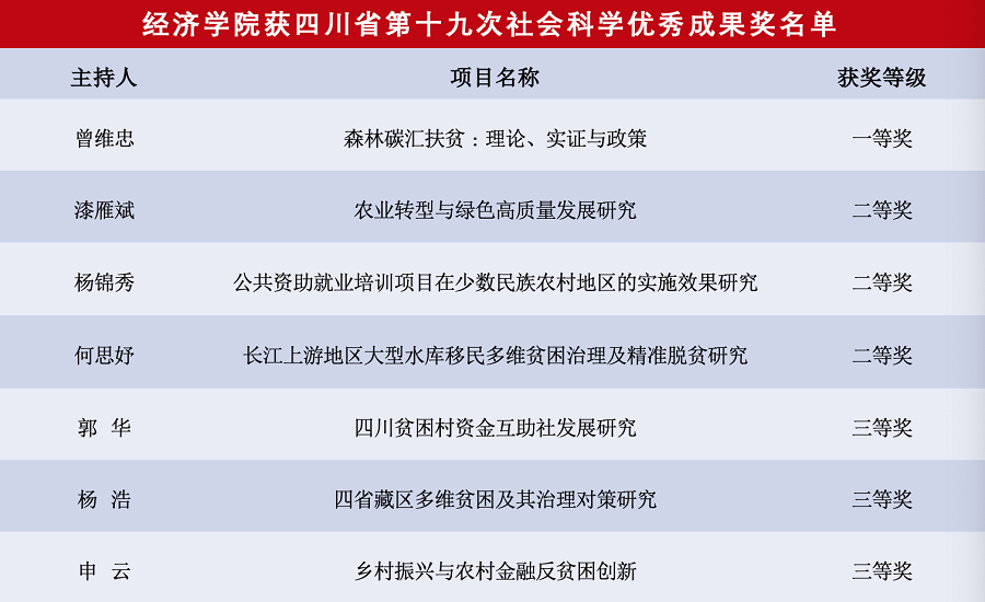 日前,《川观新闻》和四川省社科联官方网站公告了四川省第十九次社会科学优秀成果奖获奖名单,威尼斯官网共有主持的7项研究成果获奖,其中一等奖1项、二等奖3项、三等奖3项。由申云博士、徐斌博士、郭丽丽博士参与3项获二等获。获奖名单有:曾维忠教授、杨锦秀教授、漆雁斌教授、何思妤教授、郭华副教授、杨浩副教授、申云博士,详细获奖名单如下: