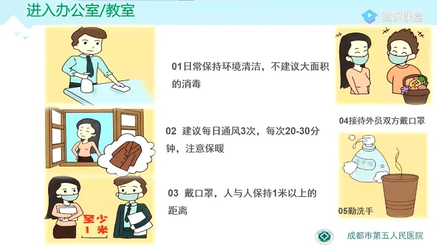 同时她强调到:日常生活中应正确佩戴口罩,避免乘坐公共交通,避免接触车上物品;根据成都市近期确诊病例的行程,她提醒同学们在电梯等密闭公共场所尽量不说话、不摘口罩,做好自身防护。