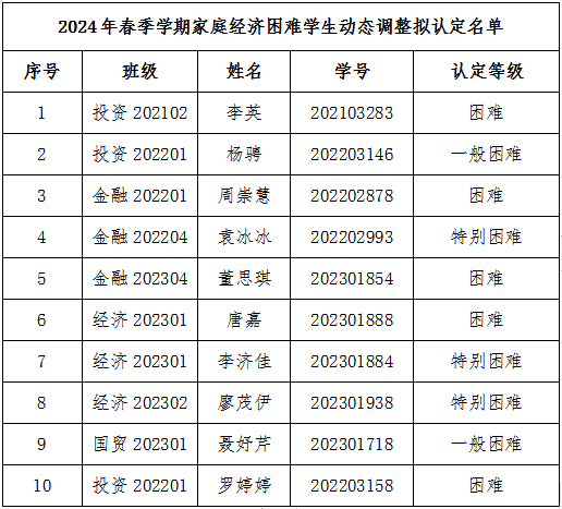 经学生本人自愿申请,小班评议组评议、公示,学院督察、审核,根据学校《家庭经济困难学生认定工作实施细则》“在学院范围内公示3个工作日”的规定,学院现将2024年春季学期家庭经济困难学生动态调整拟认定名单公示如下: