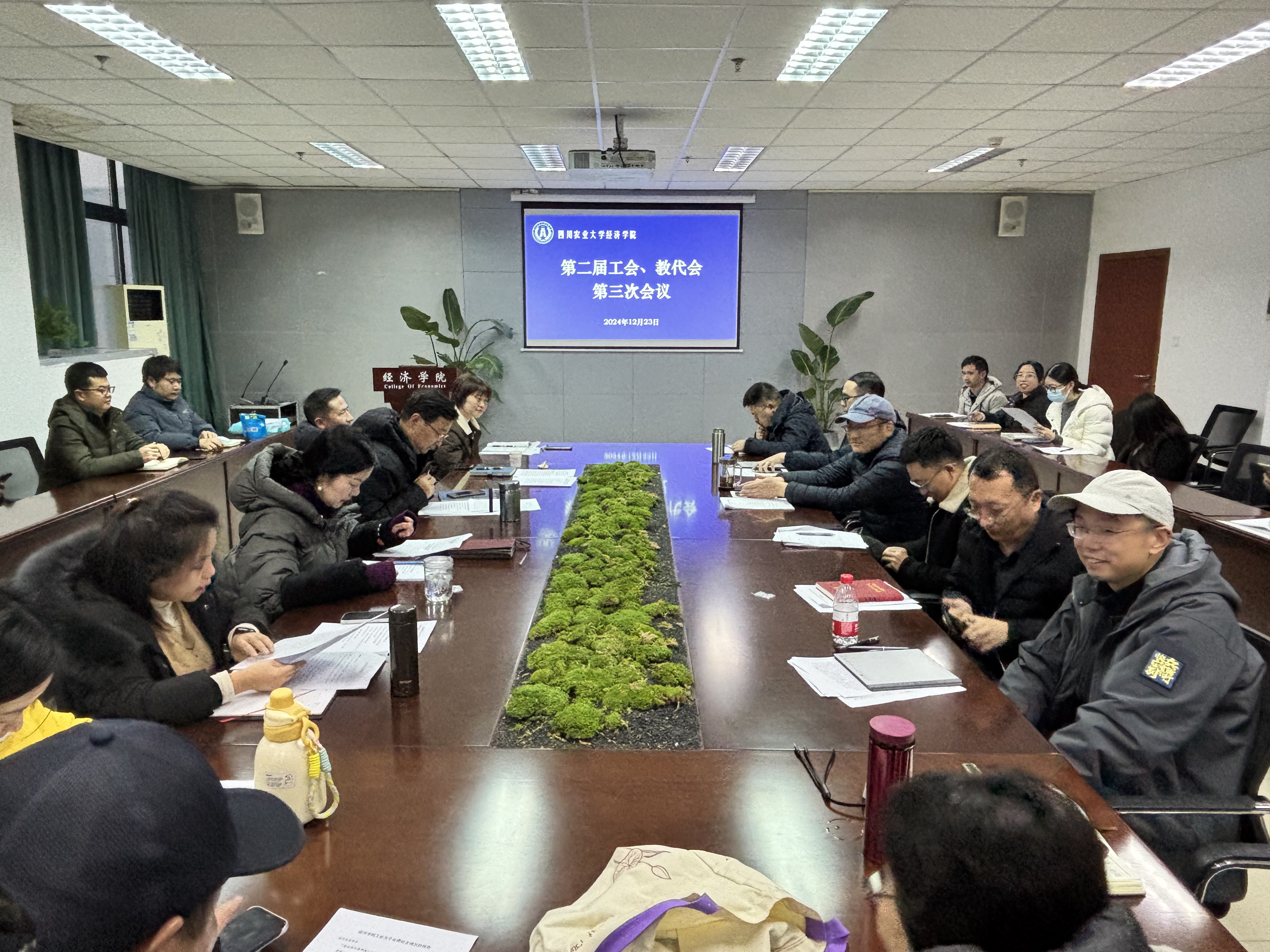 曾维忠2024年学院工作报告,刘思麟作2024年学院财务收支报告。《报告》对照十四五目标任务,从党的二十届三中全会背景下的全面从严治党情况学科专业建设、研究生培养管理、本科生培养质量、科学研究水平、师资队伍建设、国际交流合作、师生幸福获得感等方面全面总结了过去一年全院教职工所做的各项工作,并提出2025年的工作思路和努力方向。回顾过去,展望未来,曾维忠代表学院领导班子对全体教职员工一年来为推动学院发展做出的贡献和成绩表示感谢和肯定,同时指出,2025年是“十四五”规划的收官之,希望全体教职员工拿出实干的精神和劲头,认真梳理学院十四五规划,以应用经济学博士点一级学科持续创建为统领,整合资源,挂图作战,力争在重大项目、顶刊论文、国家级人才等关键性指标上破局,同时,加强校企合作,提高人才培养质量,促进学院各项工作百尺竿头、更进一步,为实现“十五五”良好开局打牢基础。曾维忠代表学院领导班子向全体教职员工致以新年的祝福。